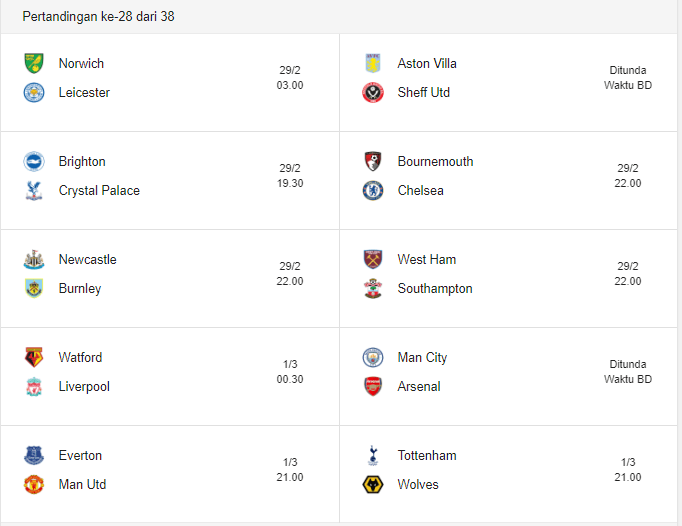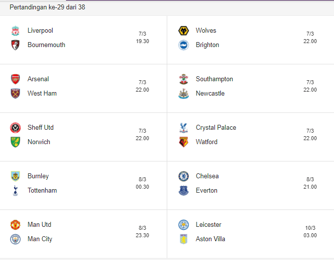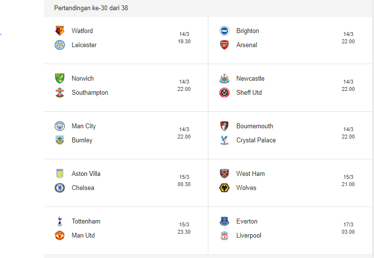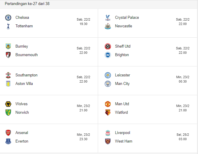 JADWAL LIGA INGGRIS PEKAN KE-26 PEKAN KE-27 PEKAN KE-28 PEKAN KE-29 PEKAN KE-30 Bagikan ini: Klik untuk berbagi di X(Membuka di jendela yang baru) X Klik untuk membagikan di Facebook(Membuka di jendela yang baru) Facebook Suka Memuat...